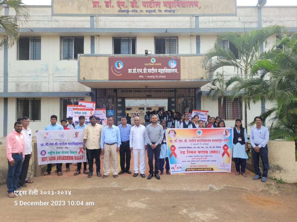 मलकापूर- पेरिड येथील रयत शिक्षण संस्थेचे, प्रा. डॉ. एन. डी. पाटील महाविद्यालयात रेड रिबन क्लब, मलकापूर यांच्या सहकार्याने 05 डिसेंबर रोजी राष्ट्रीय सेवा योजना, राष्ट्रीय छात्र सेना व प्राणीशास्त्र विभाग यांच्या वतीने एड्स रॅली व एड्स जनजागृती विषयक शपथ वाचन कार्यक्रमाचे आयोजन करण्यात आले. याप्रसंगी विद्यार्थी व प्राध्यापकांनी एड्स दिनानिमित्त शपथीचे सामूहिक वाचन केले. त्यानंतर एच.आय.व्ही./ एड्स जनजागरण प्रबोधन रॅली काढण्यात आली.