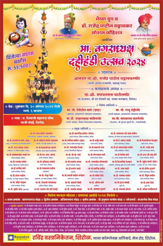 या दहीहंडी सोहळ्यासाठी खासदार धैर्यशील माने, आमदार डॉ. राजेंद्र पाटील यड्रावकर, माजी खासदार राजू शेट्टी, माजी आमदार उल्हास पाटील, श्री दत्त उद्योग समूहाचे प्रमुख उद्यानपंडित गणपतराव पाटील, गुरुदत्त शुगर्सचे चेअरमन माधवराव घाटगे, माजी नगराध्यक्ष अमरसिंह पाटील यांच्यासह विविध क्षेत्रातील मान्यवर उपस्थित राहणार आहेत हा दहीहंडी सोहळा पाहण्यासाठी शुक्रवारी सायंकाळी ६ वाजता नागरिकांनी मोठ्या संख्येने उपस्थित राहावे असे आवाहन, भैया ग्रुपचे सुरज कांबळे यांनी केले आहे.