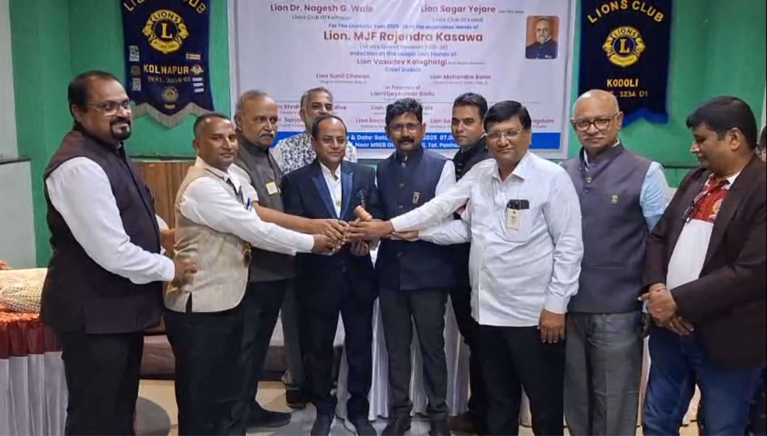 पन्हाळा तालुक्यातील कोडोली येथे लायन्स क्लब ऑफ कोल्हापूर आणि लायन्स क्लब ऑफ कोडोली यांचा 2025-26 चा पदाधिकाऱ्यांचा पदग्रहण व शपथ समारंभ पार पडला यावेळी सन 2025-26 करिता लायन्स क्लब ऑफ कोल्हापूर साठी अध्यक्ष म्हणून डॉक्टर नागेश वाले, सेक्रेटरी अरविंद पवार खजिनदार संभाजीराव पवार यांची निवड करण्यात आली.तर लायन्स क्लब ऑफ कोडोली अध्यक्षपदी सागर येजरे,सेक्रेटरी सविता येजरे आणि खजिनदार पदी अनिरुद्ध घोरपडे यांची निवड करण्यात आली,लायन्स इंटरनॅशनल डिस्ट्रिक्टचे प्रथम उपप्रांतपाल राजेंद्र भाई कासवा, पीडीजी वासुदेव कलगटगी यांच्या प्रमुख उपस्थितीत नूतन पदाधिकारी व सदस्यांना शपथ देण्यात आली.