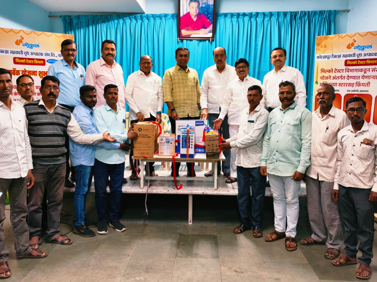 कोल्हापूर, ता.२७: कोल्हापूर जिल्हा सहकारी दूध उत्पादक संघ (गोकुळ) संलग्न प्राथमिक दूध संस्थांची दुधातील फॅट, एस.एन.एफ तपासणीचे जुने (मिल्को टेस्टर) मशीन कंपनीना बायबॅक (पुनर्खरेदी) करून नवीन दूध तपासणीचे अॅनालायझर मशीन उपलब्ध करून देण्याची योजना सुरू करण्यात आली असून, या योजनेमधील सहभागी गोकुळ संलग्न प्राथमिक दूध संस्थांना नवीन अॅनालायझर मशीनचे वाटप आज गोकुळचे चेअरमन नविद मुश्रीफ यांच्या हस्ते व संचालक मंडळाच्या उपस्थितीत प्रधान कार्यालय, गोकुळ शिरगाव येथे करण्यात आले. यावेळी प्राथमिक दूध संस्थांचे प्रतिनिधी व मिल्क अॅनालायझर कंपनीचे प्रतिनिधी, कर्मचारी उपस्थित होते.